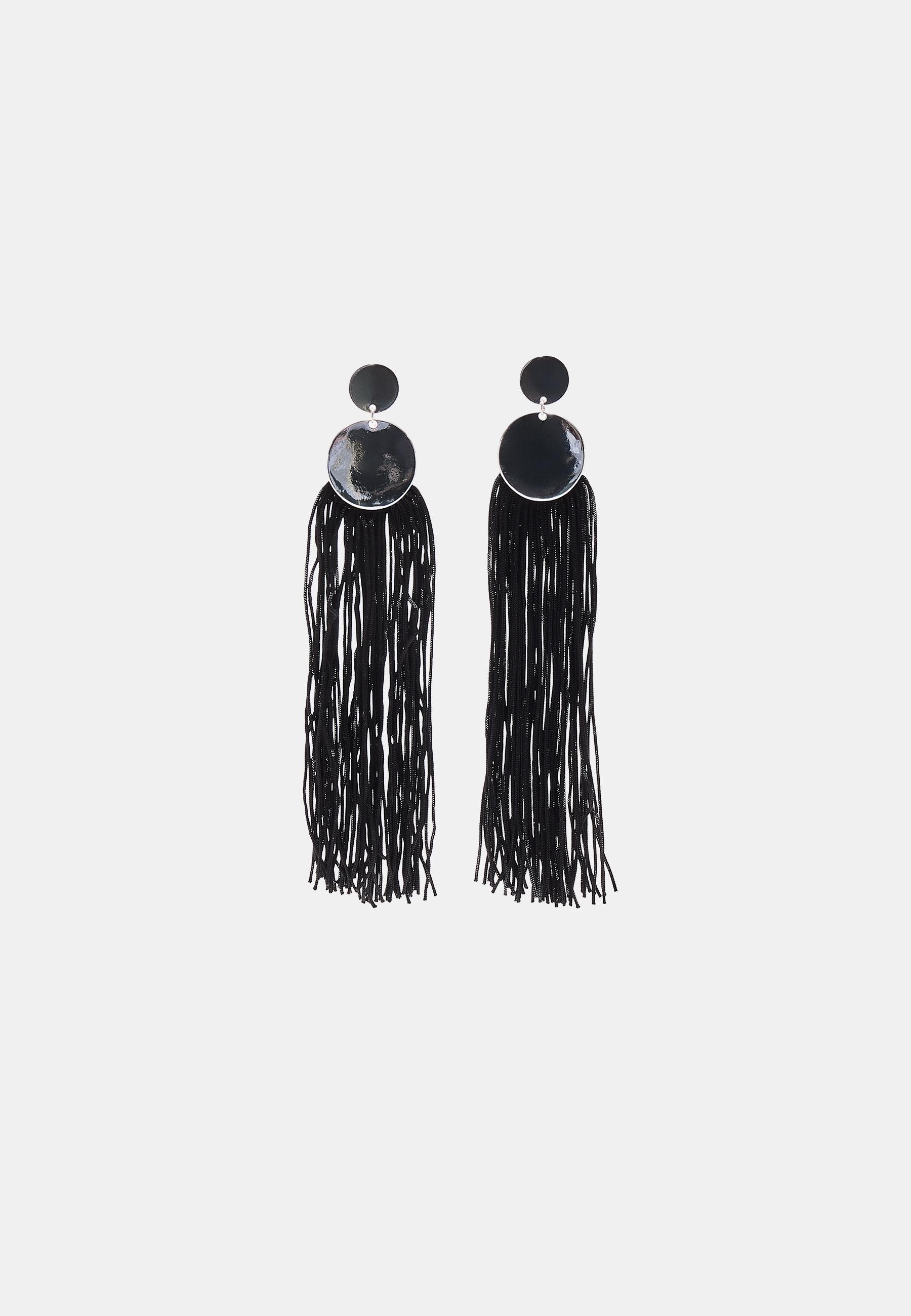 Black Disc & Long Tassel Drop Earrings