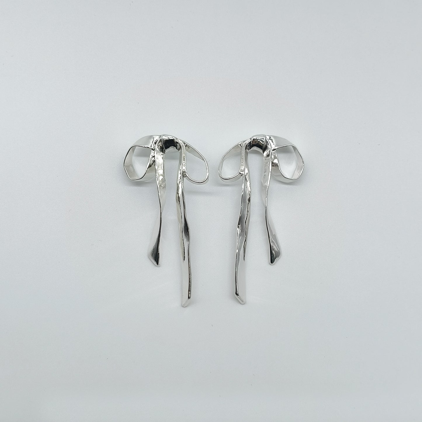 These silver bow drop earrings showcase a fluid ribbon-inspired silhouette, crafted in high-shine metal for a bold yet feminine finish. The elongated tails create graceful movement, making them the perfect statement earrings for both modern minimalists and maximalist glam looks.