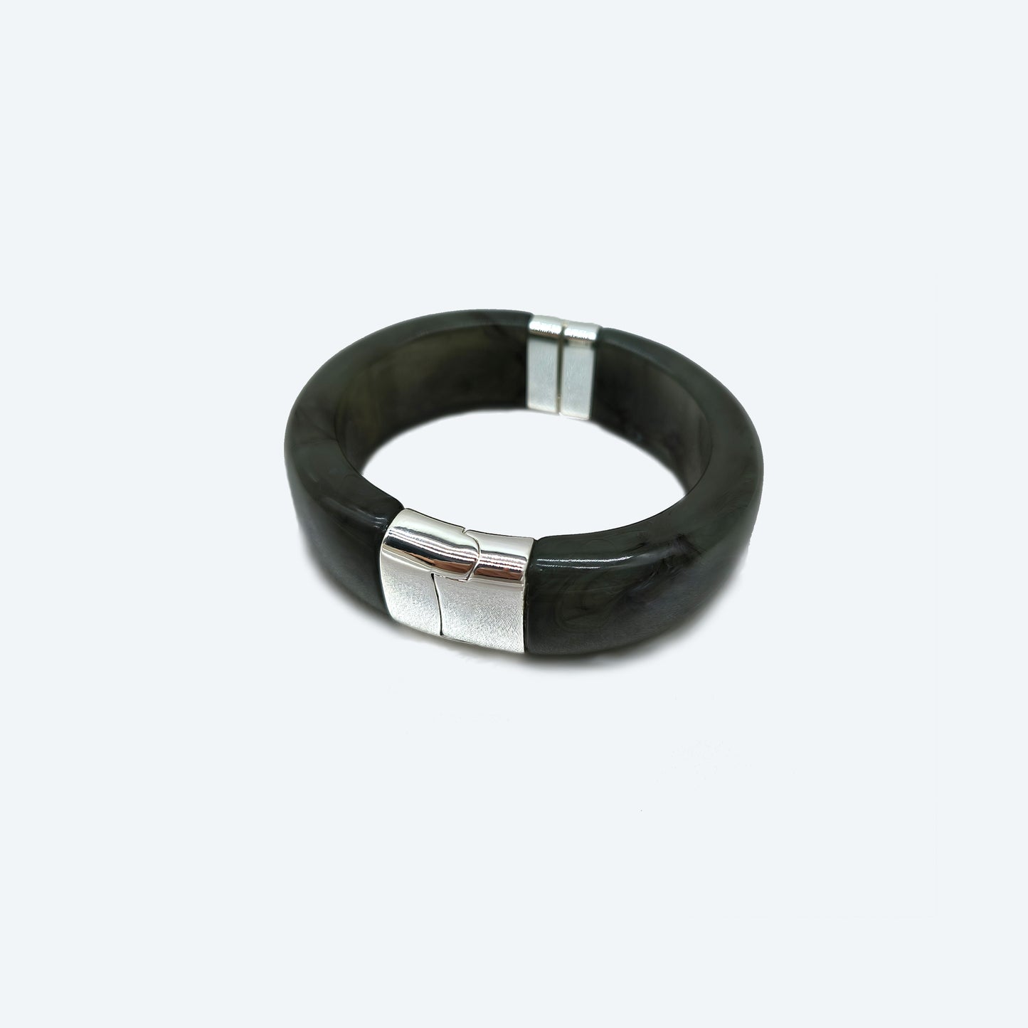 Statement Chunky black resin bangle, brass casting base, silver plated, hinged jewelry bangle