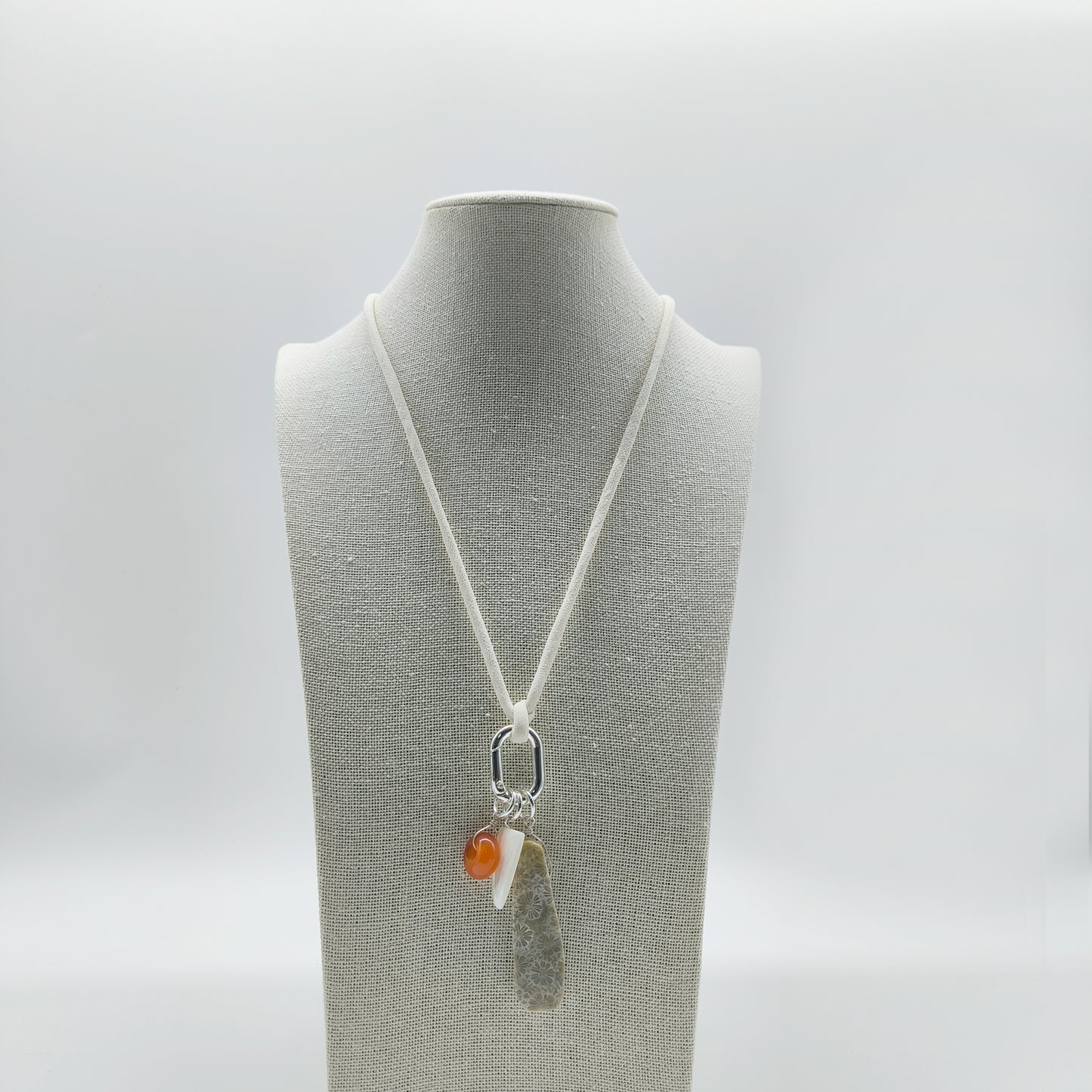 This long chiffon necklace brings together textured natural stone, warm-toned agate, and a smooth shell piece. The handmade knot and silver detail create a relaxed, earthy look with subtle contrast.