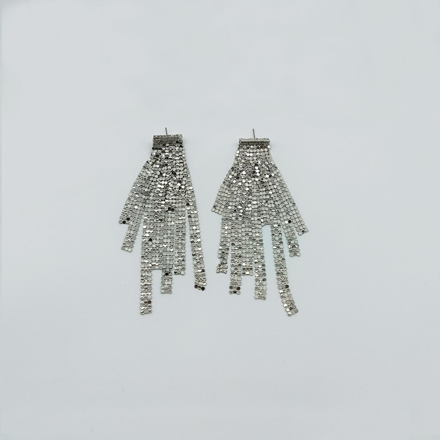 Catch every light in the room with these silver fringe earrings, crafted with layered rhinestone strands that create a cascading waterfall effect. Bold yet fluid, they're made for nights out, party looks, and all things glam.