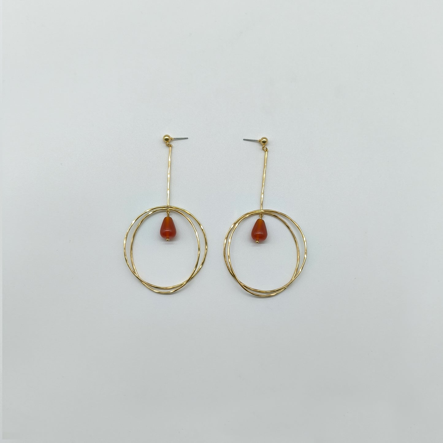 These gold dangle earrings combine minimalist double wire hoops with a teardrop-shaped orange bead at the center. Their elongated drop and bold shape create an elegant silhouette, ideal for geometric jewelry lovers and statement earring collections.
