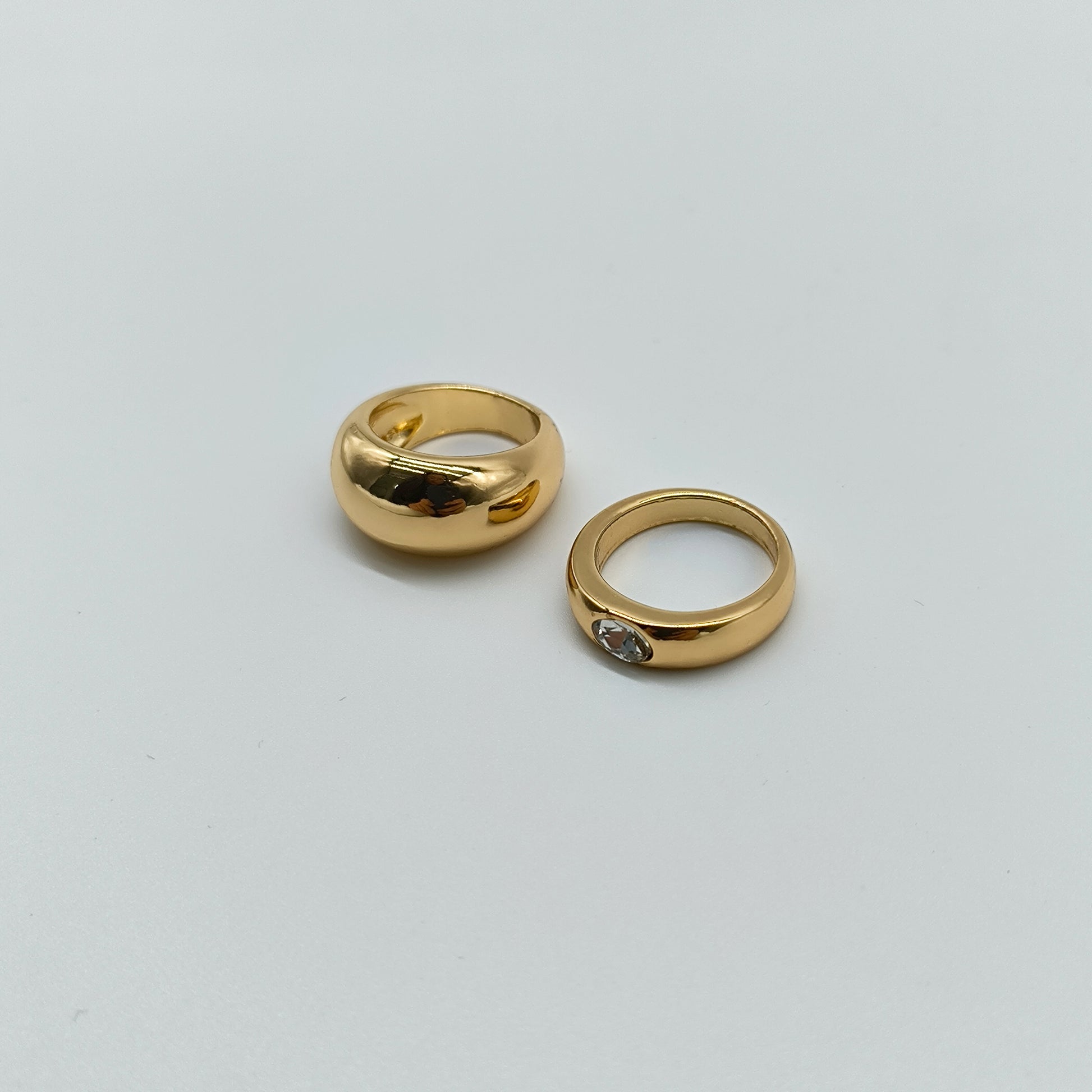 This gold ring set includes a bold dome band and a slim ring with a clear crystal accent. Whether worn together or styled separately, they bring contrast and balance to any ring stack. Perfect as a minimalist gold ring duo or an everyday gold band pairing.