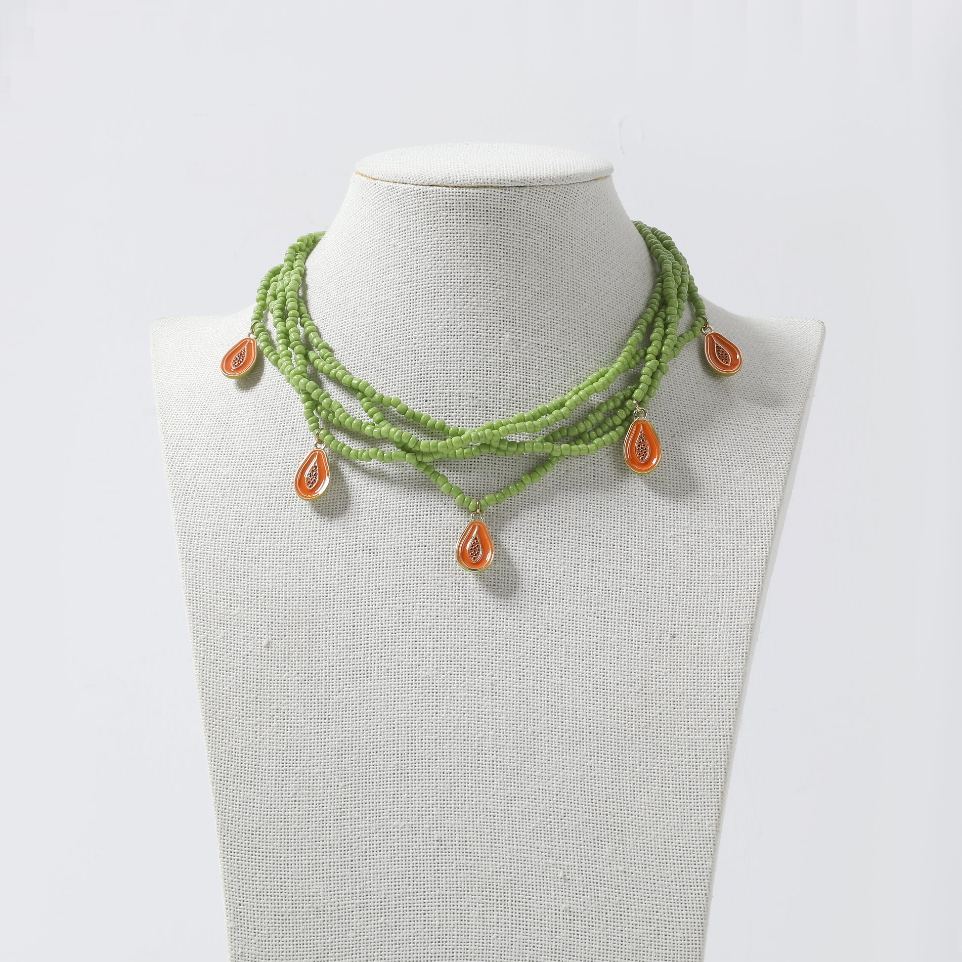Green Beaded Multi-Layer Necklace with Orange Enamel Papaya Charms