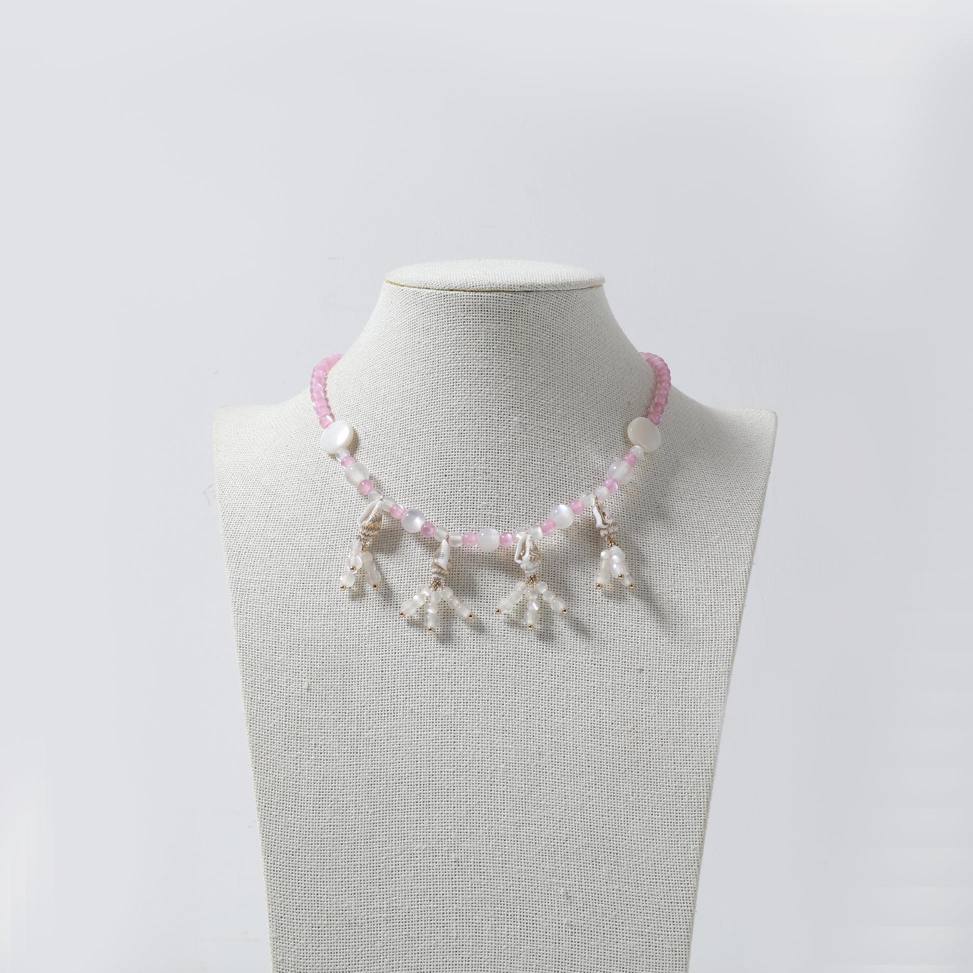 Pink Beaded Necklace with Shell Disc & Tassel Charms