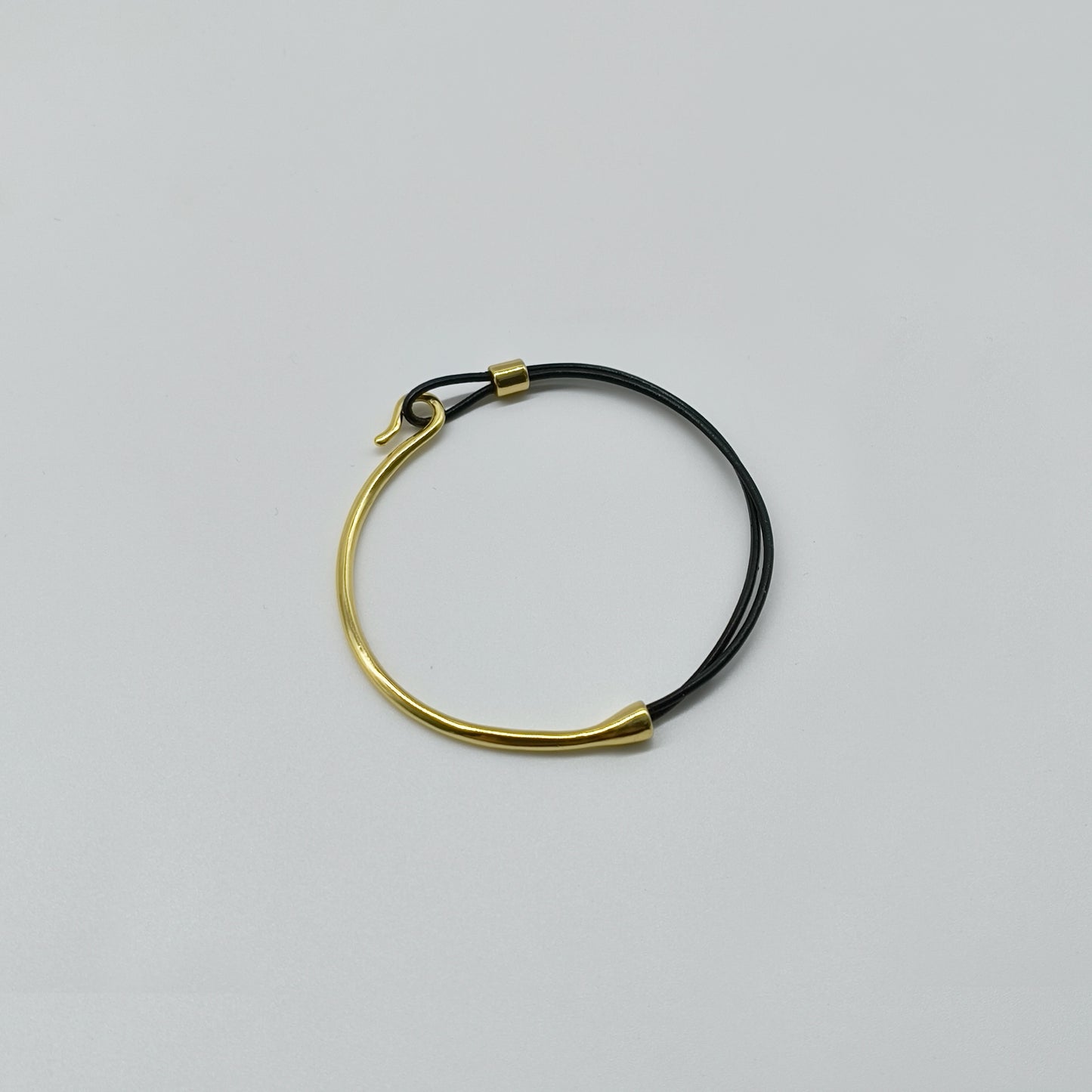 This leather cord bracelet combines a polished gold curved bar with a multi-strand black leather strap, offering a clean, adjustable fit. A modern, unisex piece that works as a minimalist gold bracelet for everyday wear or layered styling.