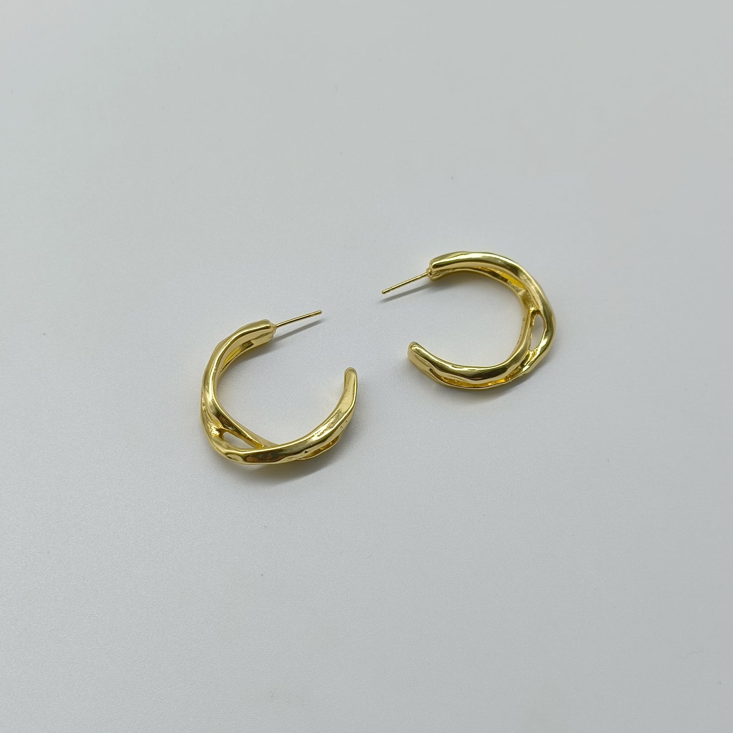 These medium gold hoop earrings have an irregular curved shape with a soft organic twist, offering a unique take on the classic gold hoops. The open design and textured gold finish add subtle movement, making them perfect as everyday modern gold earrings or layered with other minimalist styles.
