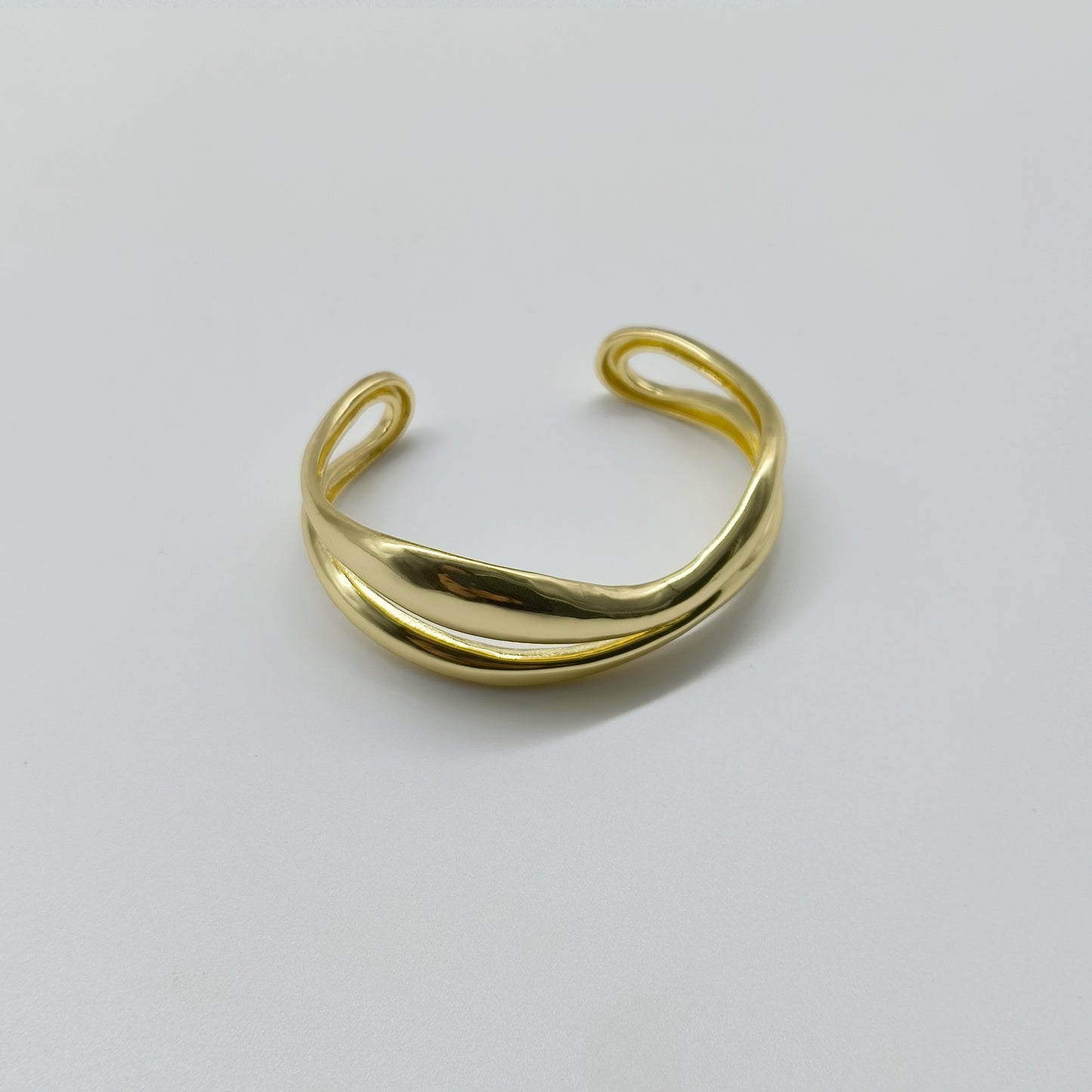 This gold cuff bracelet curves gently around the wrist with a smooth, open shape. Its bold yet minimal look makes it easy to wear solo or stacked with other pieces.