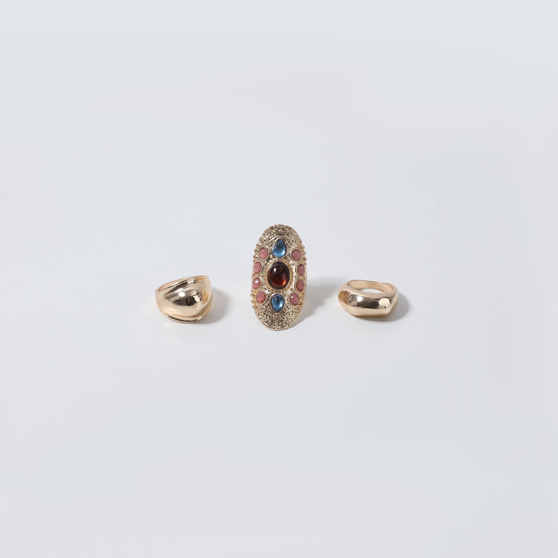 Gold Chunky Dome & Ornate Multi-Stone Oval Ring Set